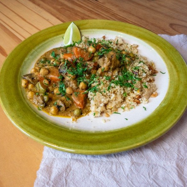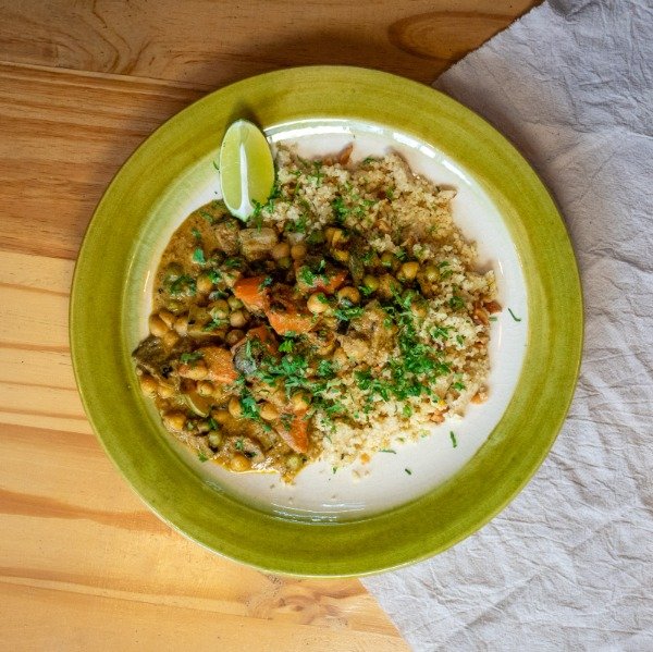 Plato vegetariano hindu con garbanzos, verduras salteadas, yogur y crema, acompañado de trigo burgol con ralladura de cítricos, castañas, almendras y cilantro.