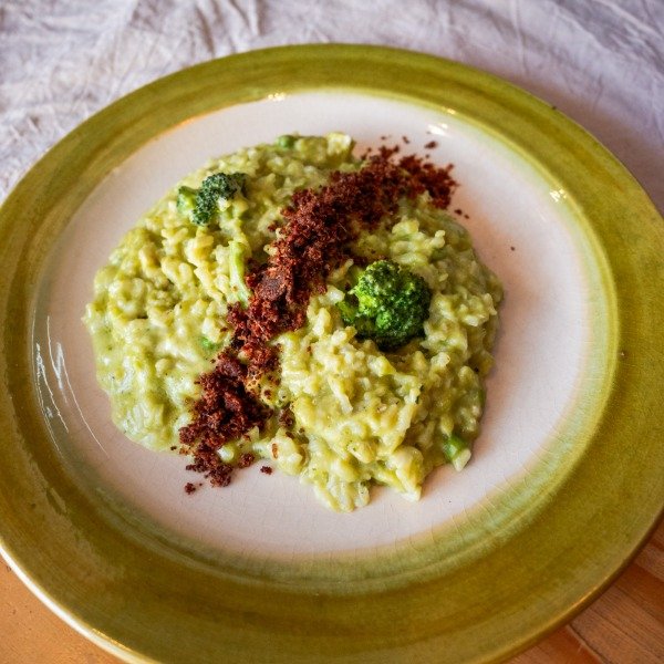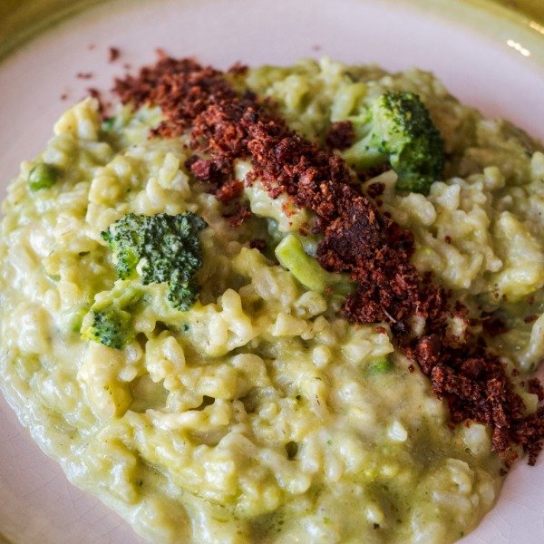 Risotto de brocoli con arvejas, queso brie y polvo de panceta (opcional)